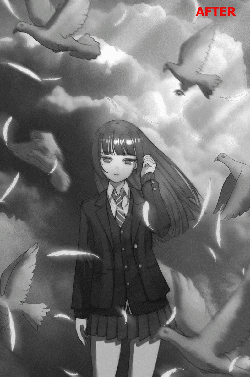 Maintenant, ce avec quoi nous allons jouer, c'est le ciel derrière la fille et ces colombes. Je vais utiliser la méthode de la section précédente avec le [Masque de calque] et le [Flou gaussien] pour flouter les parties inutiles ou indésirables de l'arrière-plan.