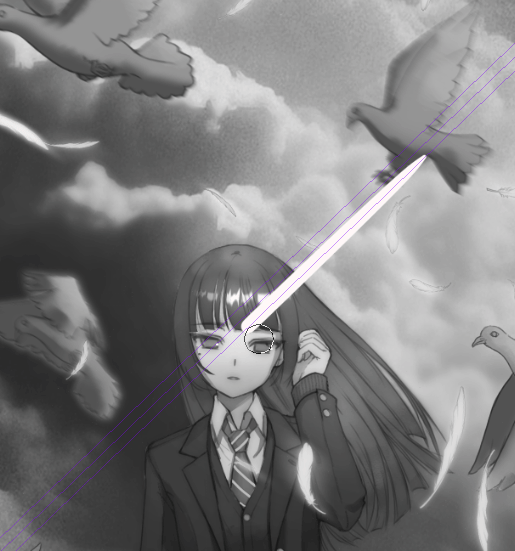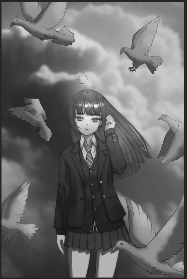 Voyons ce que nous avons dans cette œuvre... des colombes qui volent autour d'une fille et un ciel en arrière-plan. Mais je pense que je vais d'abord donner vie à notre dessin au trait, un peu comme un effet de halo. Avant cela, laissez-moi organiser un peu les calques, etc. pour faciliter les choses !
