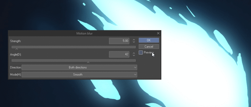 Pour l'angle du flou, je veux qu'il soit d'environ 30 degrés et je choisis [Avant] comme direction du flou. Pour montrer que la colombe vole vers l'avant. Et bien sûr, avec le mode [Lisse] pour rendre le mouvement beaucoup plus doux.