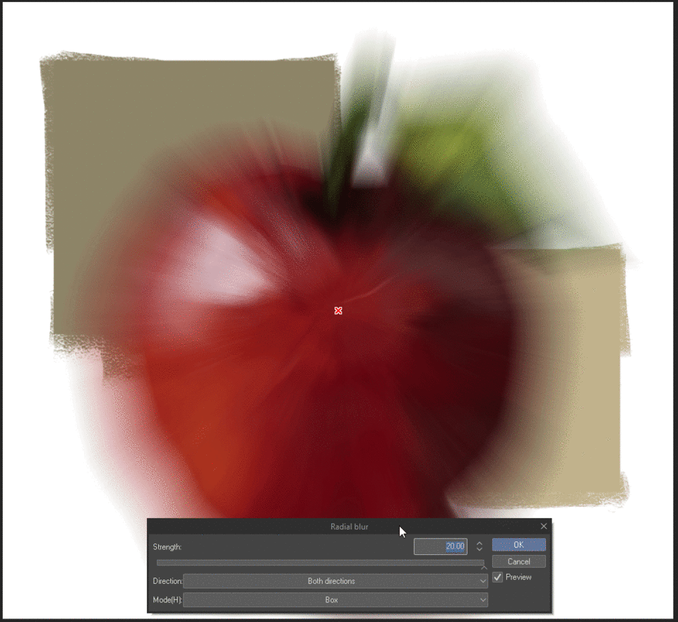 Il est bon d'avoir la possibilité de contrôler le centre du flou radial en déplaçant la croix rouge [x] sur le canevas.