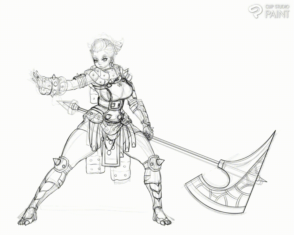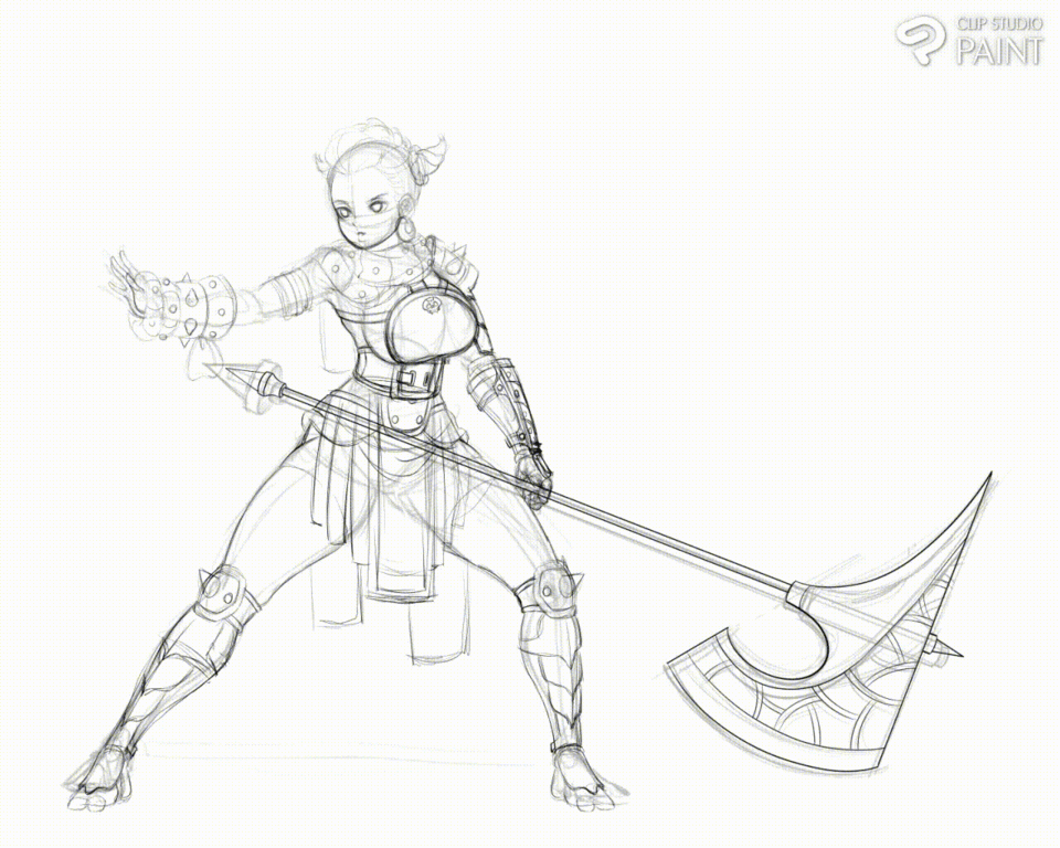 En utilisant l'une des poses de combat ci-dessus, nous commençons à ébaucher ou à esquisser notre personnage en nous basant sur notre design initial de personnage. Nommons ce calque 'Pose' et changeons l'opacité du calque à 30-50%, selon votre préférence. Maintenant, vous pouvez utiliser le pinceau que vous voulez, personnellement, mes outils de choix pour cela sont l'[outil Plume> sous-outil Plume G] ou l'[outil Crayon> sous-outil Crayon Plus foncé] .