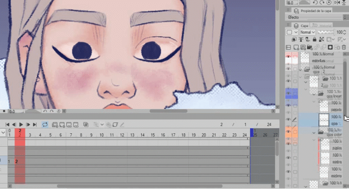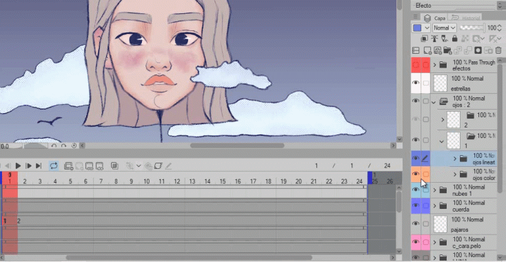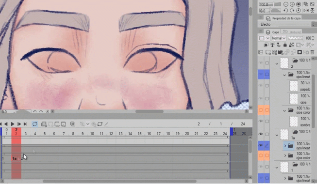 Vous remarquerez qu'en déplaçant le groupe dans le dossier d'animation avec le lineart et la couleur, qui s'appelle maintenant (1), les yeux ne sont plus visibles dans la chronologie. Ne vous inquiétez pas, c'est tout à fait normal.