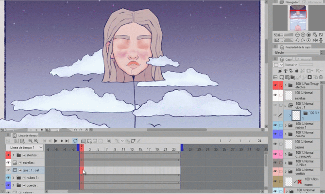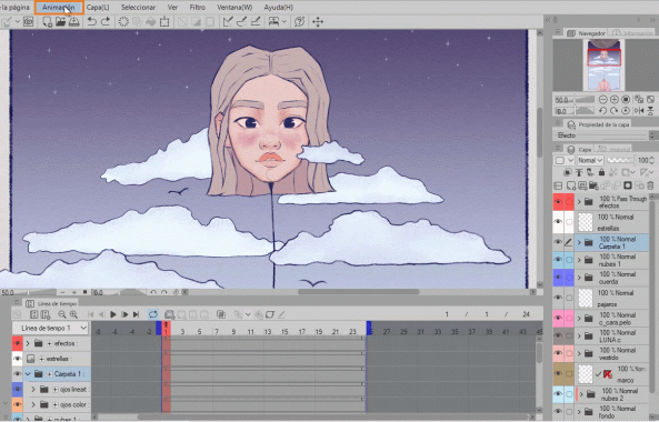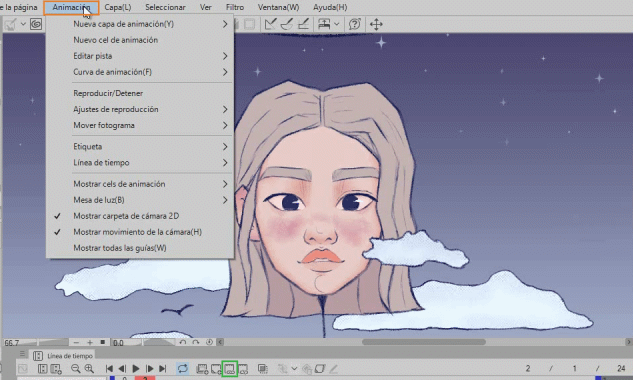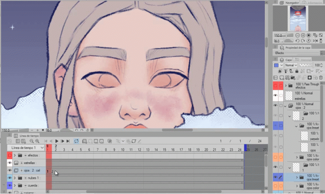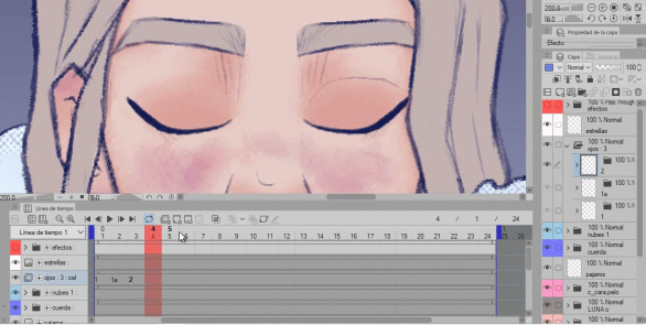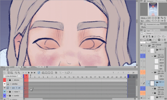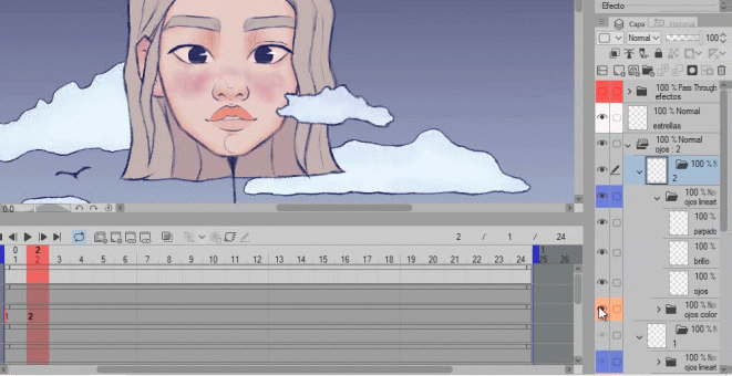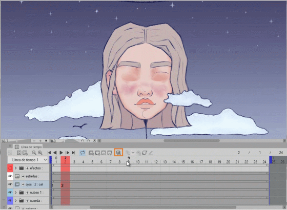 Comme vous pouvez le voir, le 2 est vide, nous y dessinerons les yeux fermés et en activant le papier oignon, les yeux ouverts (1) apparaissent en vert, ce qui nous permet de suivre facilement.