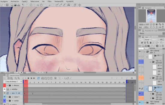 Et dans le groupe 2 (où nous dessinerons les yeux fermés), je masque le calque de couleur (orange) et supprime l'éclat des yeux car nous ne l'utiliserons pas puisque les yeux sont fermés. Je supprimerai également le contour des yeux car ce que nous avons déjà ne nous sert pas pour des yeux fermés et je dessinerai à partir de zéro sur le même calque appelé "yeux".