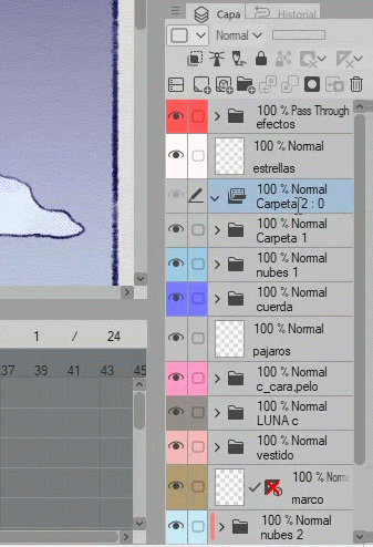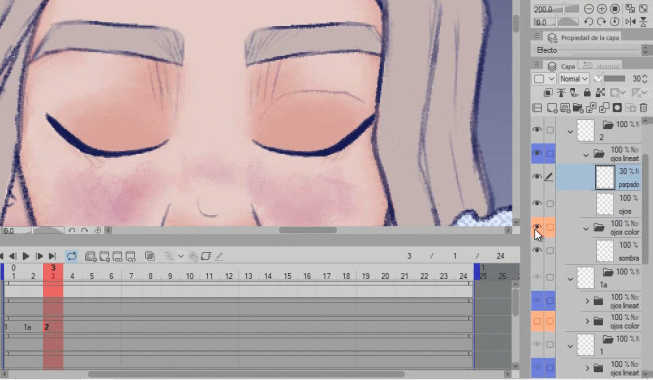 Nous continuerons avec la couleur de l'œil fermé (2), nous supprimons le groupe de couleur car il ne nous sert pas pour les yeux fermés, nous créons un nouveau calque et nous colorions dessus.