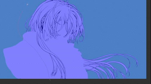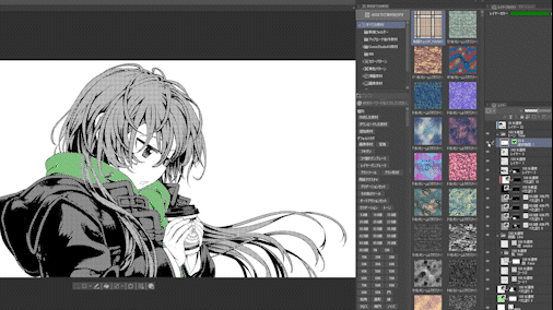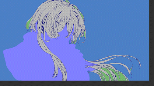 En affichant les autres line arts pour remplir les zones non couvertes, puis en les masquant à nouveau pour effacer les parties superflues... en répétant ce processus, j'ai pu appliquer les trames sur les cheveux en environ 3 minutes.