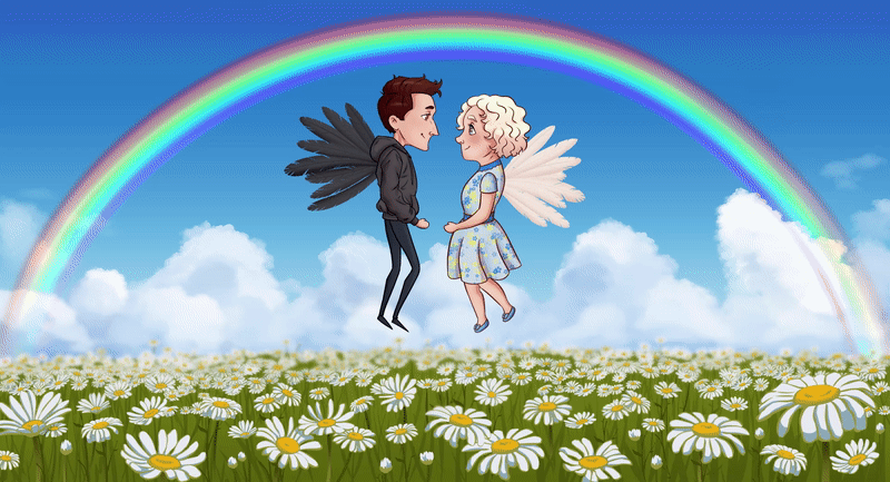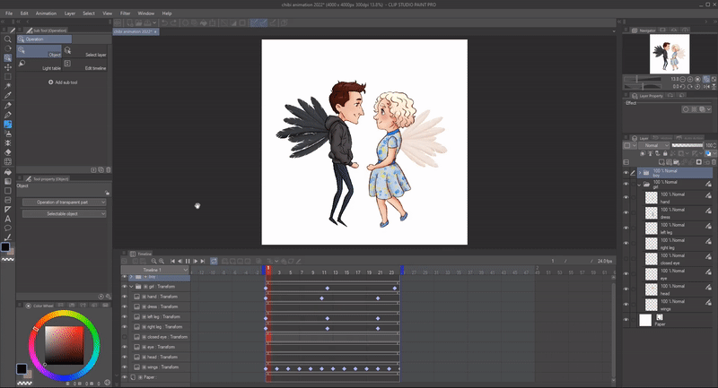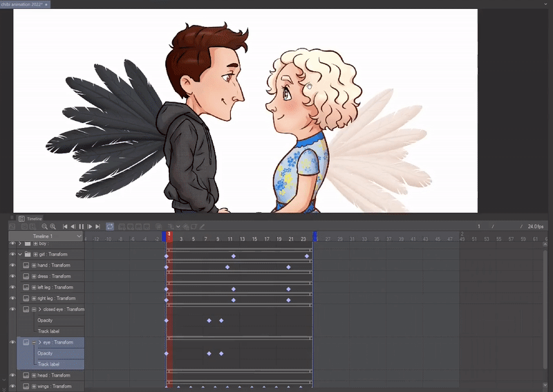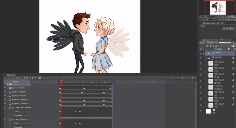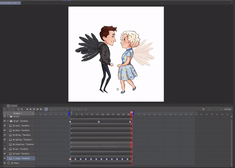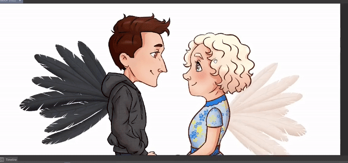 Comme vous pouvez le voir dans la capture d'écran ci-dessus, j'ai un dossier séparé pour le garçon et un dossier séparé pour la fille. Vous devez placer chaque objet qui bougera sur un calque différent. Par exemple, j'ai sa main, sa robe, ses jambes, son œil, sa tête et ses ailes sur des calques séparés. Vous devez dessiner même les parties de l'image qui ne sont généralement pas visibles dans une image statique, par exemple, derrière la main.