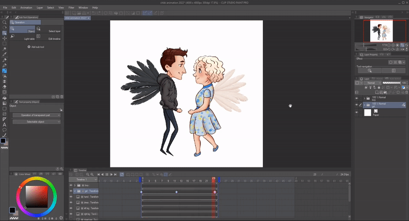 L'animation par images clés, c'est quand nous indiquons à Clip Studio Paint comment un objet doit être positionné sur l'une des images et comment il doit être positionné (ou, en général, comment il doit être transformé) sur l'une des images suivantes, et tout ce qui se trouve entre les deux est créé automatiquement par le programme.