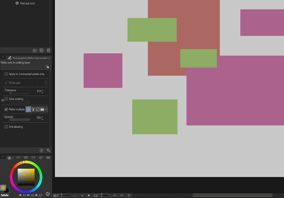 Le calque sélectionné n'est pas quelque chose que j'utilise beaucoup, car les autres fonctions sont si bonnes que je n'en ai pas besoin. Vous pouvez sélectionner de nombreux calques avec un clic gauche et l'outil de remplissage n'utilisera que ceux-là pour voir où il doit remplir les choses.