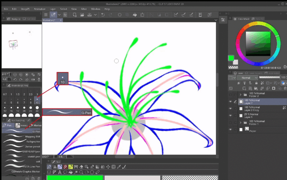 Ensuite, j'ai pris le Stylo G (taille 70) et j'ai dessiné un point sur le premier calque.