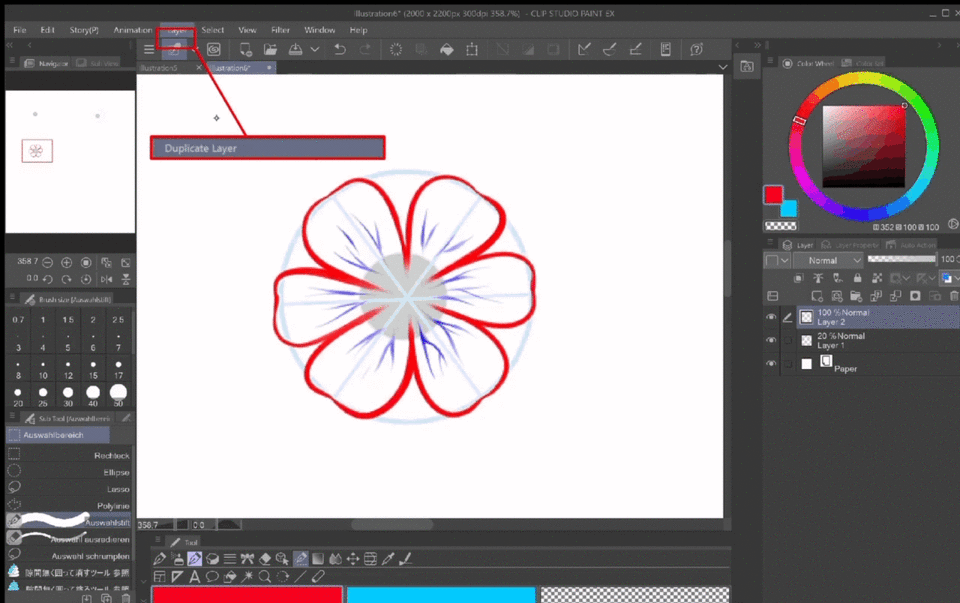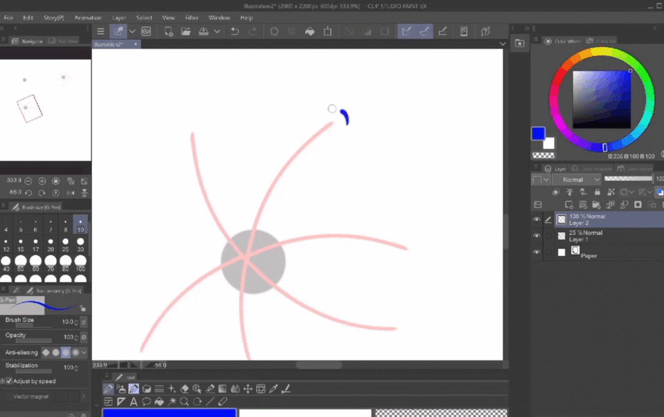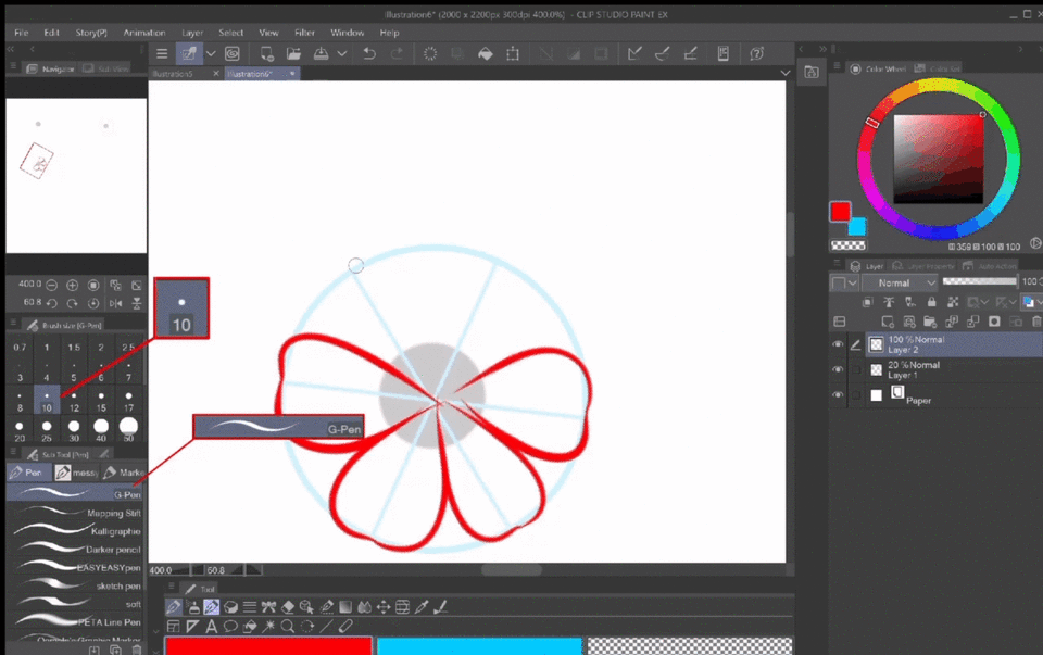 En résumé : j'ai ajouté un nouveau calque, pris un Stylo G de taille 10 et dessiné des formes presque en cœur. J'ai ensuite ajouté quelques détails sur chaque pétale et corrigé le centre où ils se rejoignent tous en gommant et en redessinant.