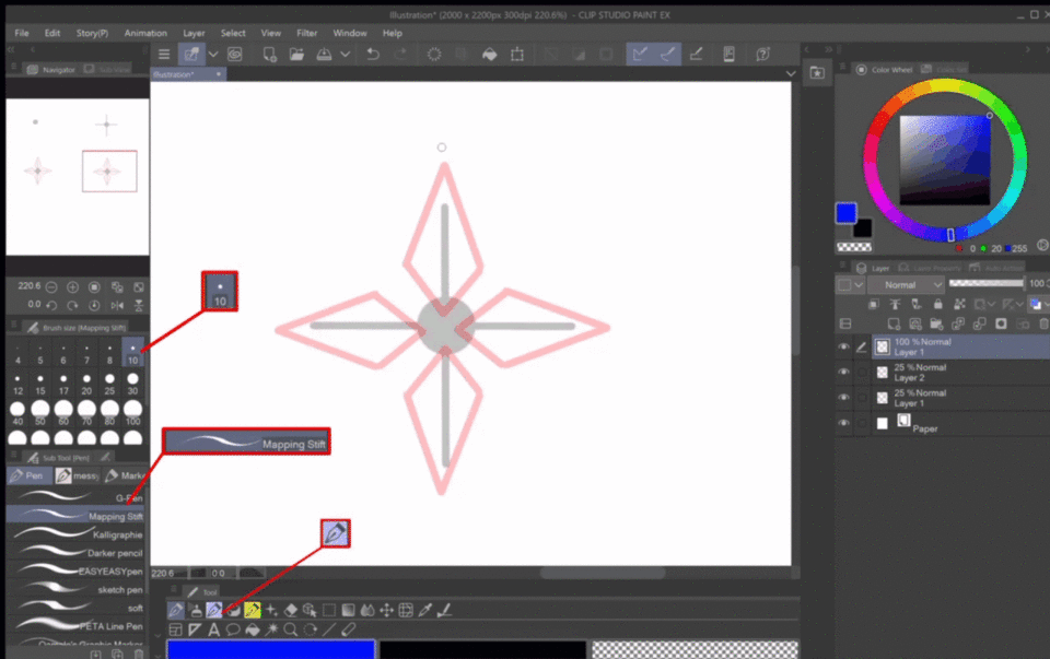 Dessinez à nouveau un point avec un "Stylo G" de taille 70.