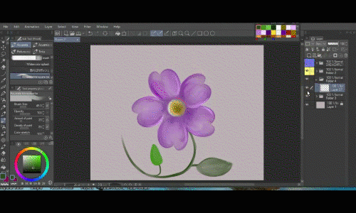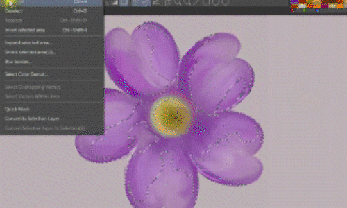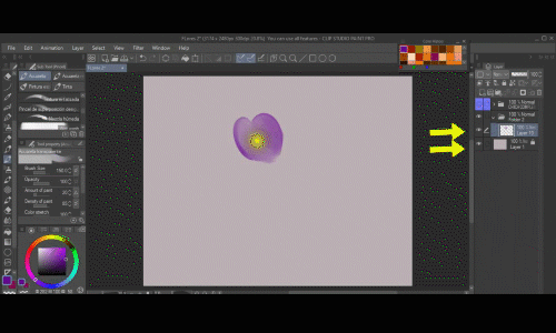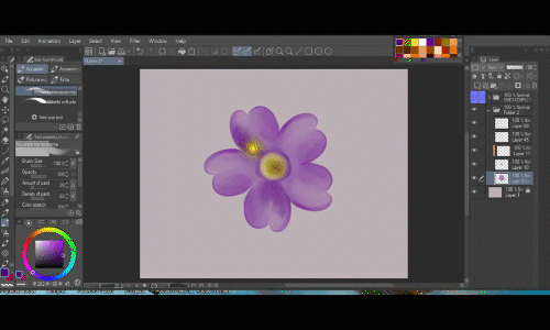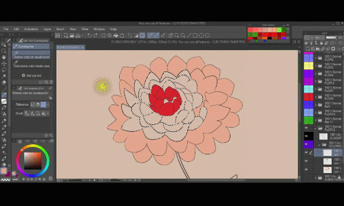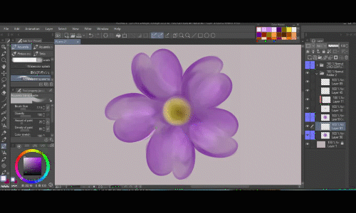 Pour peindre avec plus de liberté, je reviens au calque principal où se trouve la couleur de la fleur et je fais