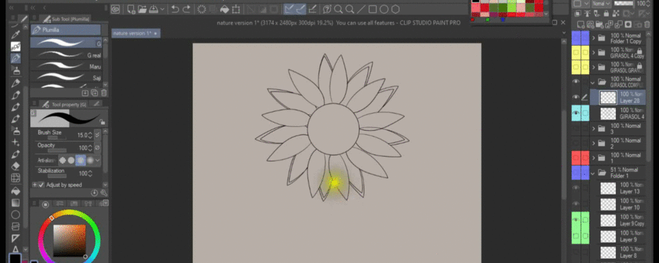Nous commençons par créer un nouveau dossier pour garder les choses en ordre et éviter de nous embrouiller. J'utilise maintenant la PLUME G pour dessiner les fleurs et la couleur noire.