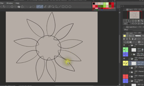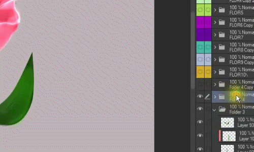 Maintenant, il est temps de dupliquer à nouveau le dossier déjà nettoyé des pétales latéraux. Je le duplique autant de fois parce que je veux vous montrer le pas à pas en photos sur le forum de CLIP STUDIO TIPS.