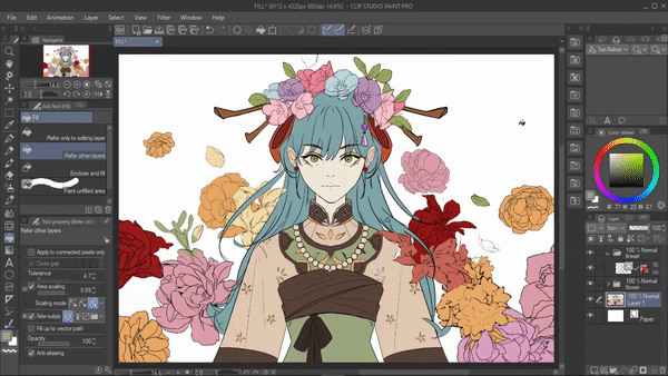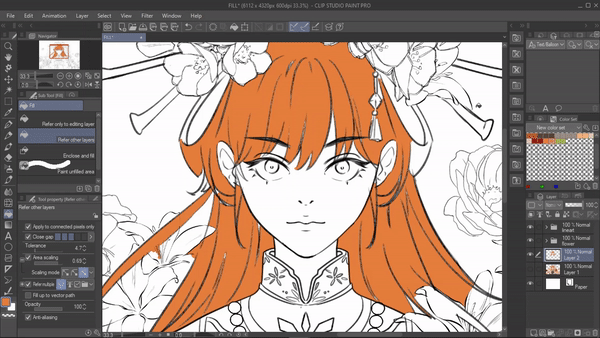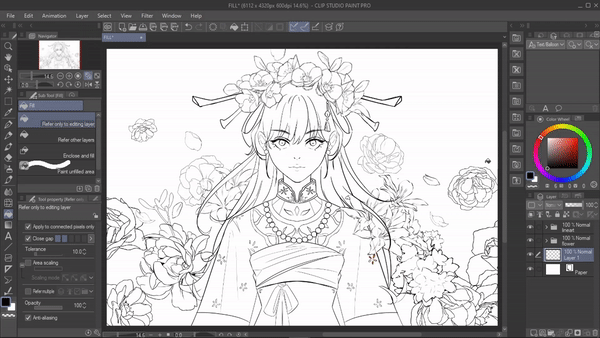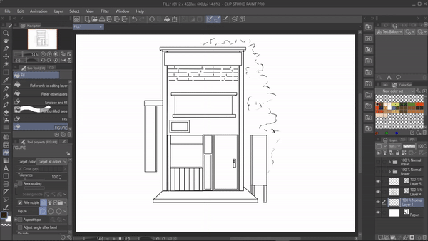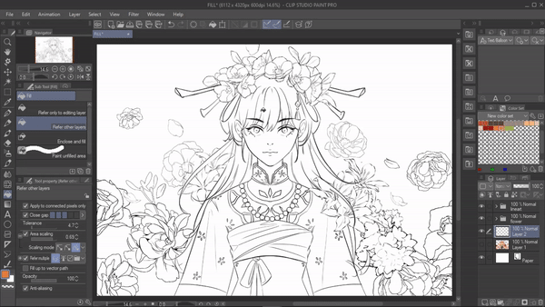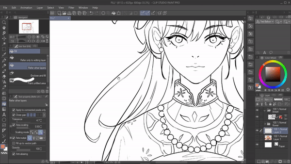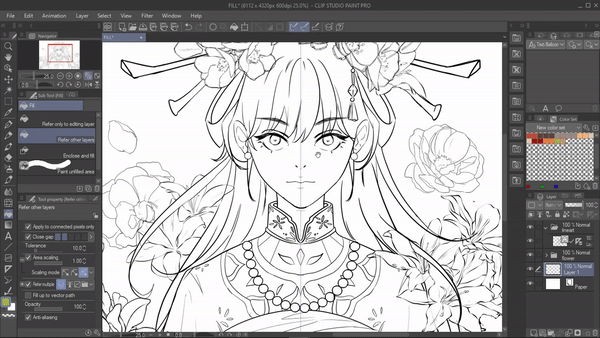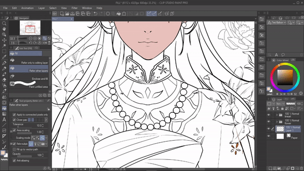 Lorsque vous remplissez de couleur votre lineart texturé, comme vous pouvez le voir, il n'est pas correctement rempli, surtout sur les zones du lineart,