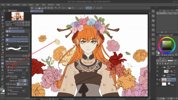 Par exemple : ici, je veux changer la couleur des cheveux, qui est orange. Je veux la changer en bleu. Pour cela, désactivez d'abord "Appliquer au pixel connecté" sous les propriétés de l'outil.
