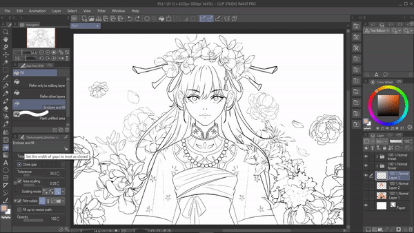 Lorsque vous avez de grands écarts comme ceux-ci, vous ne pourrez pas remplir votre couleur correctement car elle n'est pas considérée comme une zone fermée. Au lieu de chercher tous ces écarts et de les connecter, vous pouvez utiliser la fonction "Fermer les écarts".