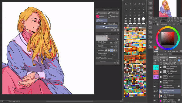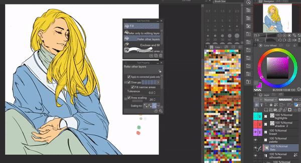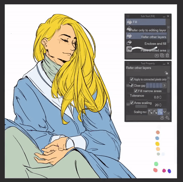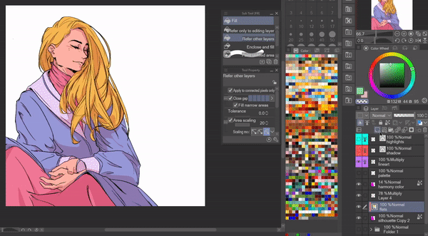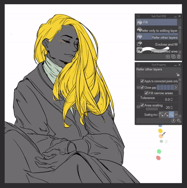 Une fois toutes les couleurs posées, vous pouvez facilement expérimenter en les changeant en désactivant le paramètre [Appliquer aux pixels connectés uniquement] dans le sous-outil [Référence aux autres calques] et en cliquant sur la couleur de base que vous souhaitez changer pour une couleur sélectionnée.