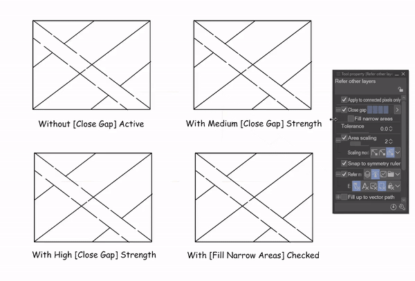 Avec la propriété [Fermer les interstices], selon la force que vous décidez, l'outil [Remplir] fermera automatiquement les petits interstices dans le dessin au trait et ne remplira pas au-delà.