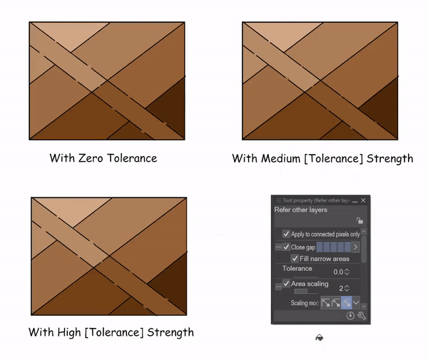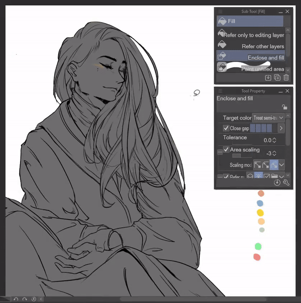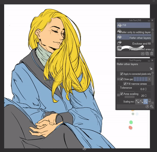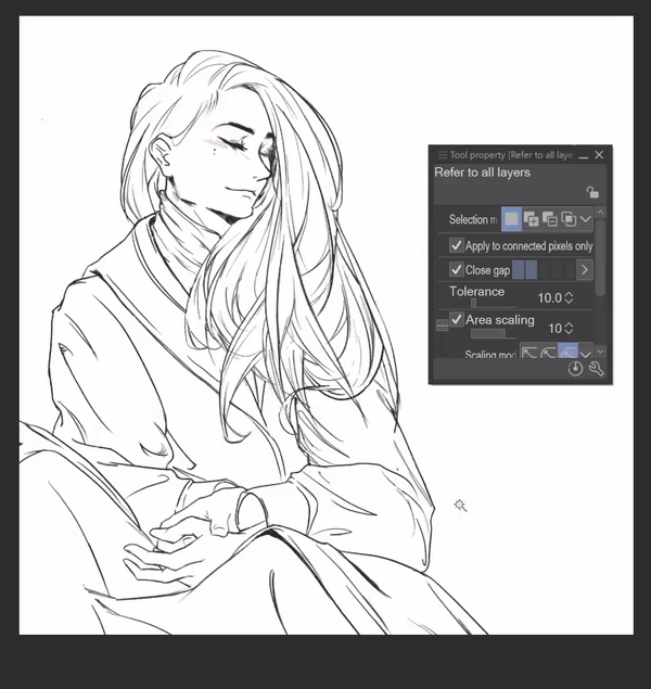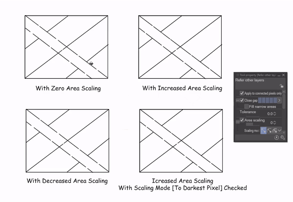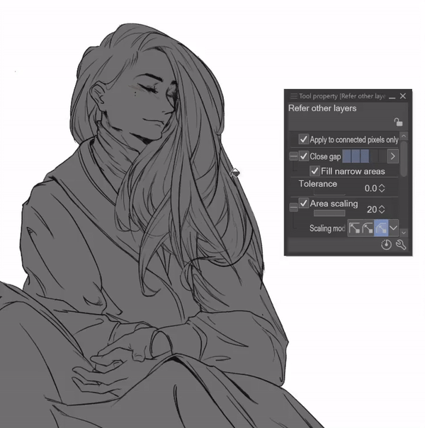 Astuce : Pour les meilleurs résultats de remplissage avec le sous-outil [Référence aux autres calques], je maintiens la mise à l'échelle de la zone élevée (environ 20) avec le mode de mise à l'échelle défini sur [Au pixel le plus sombre]. Cela me permet d'éviter les petits coins vides tout en ne laissant pas le remplissage dépasser le dessin au trait.