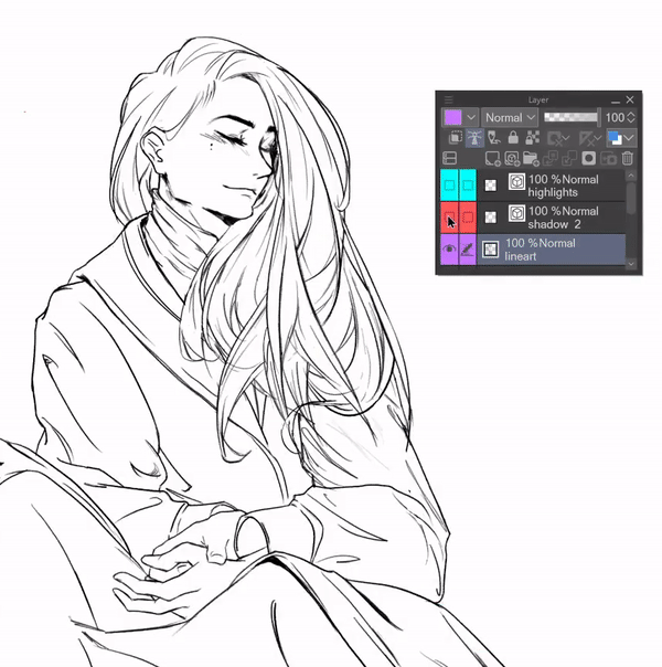 Pour un flux de travail d'ombrage cel fluide, il est préférable de définir les zones de lumière et d'ombre juste après avoir terminé le dessin au trait.