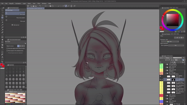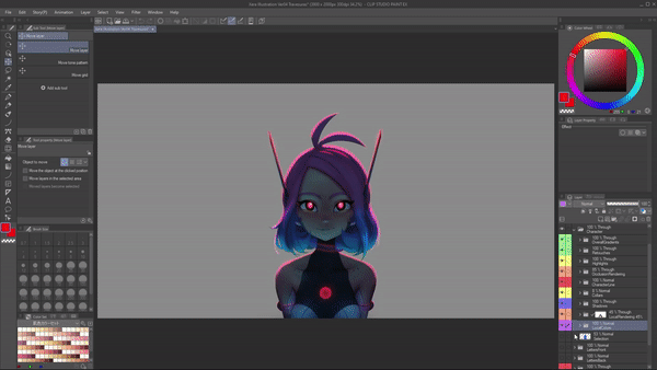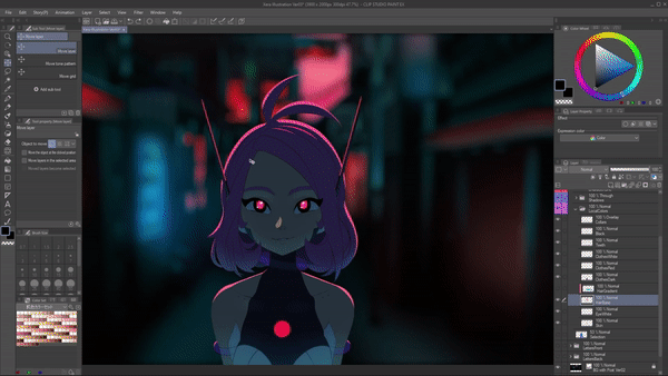 J'utiliserai le mode de fusion « Multiplier » et réduirai l'opacité de ce bleu pour donner l'impression que le personnage se trouve au milieu de ce fond. Voyez comment cela contamine toutes les couleurs locales ? Et encore une fois, je ne me soucie pas encore de l'éclairage. Juste de la faire se sentir intégrée à cet endroit. Dans ce cas, un petit détail que je vais garder est de prendre le calque de remplissage de couleur pour les yeux rouges et de le déplacer au-dessus de tout car je ne veux pas qu'il soit affecté.