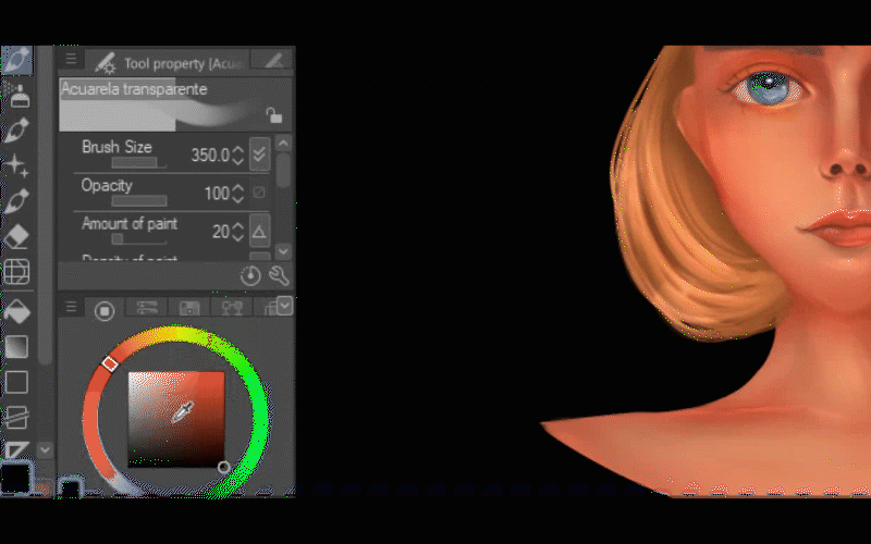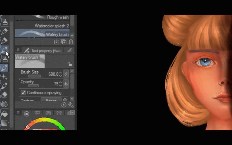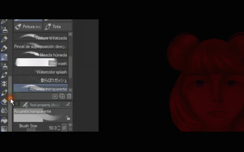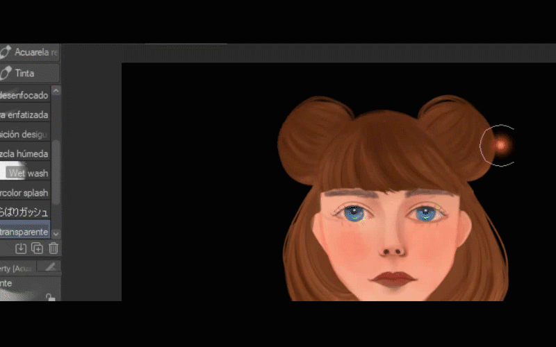 Je vais choisir le pinceau aquarelle transparent et je vais commencer à peindre la lumière sur ses cheveux et sur son visage.