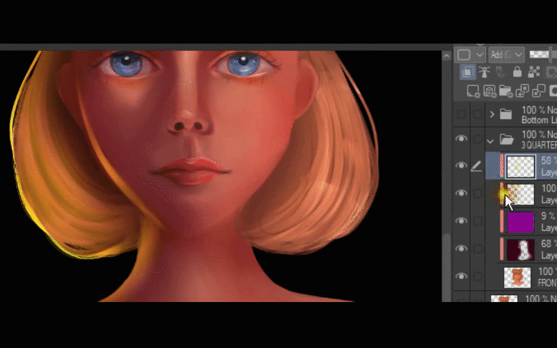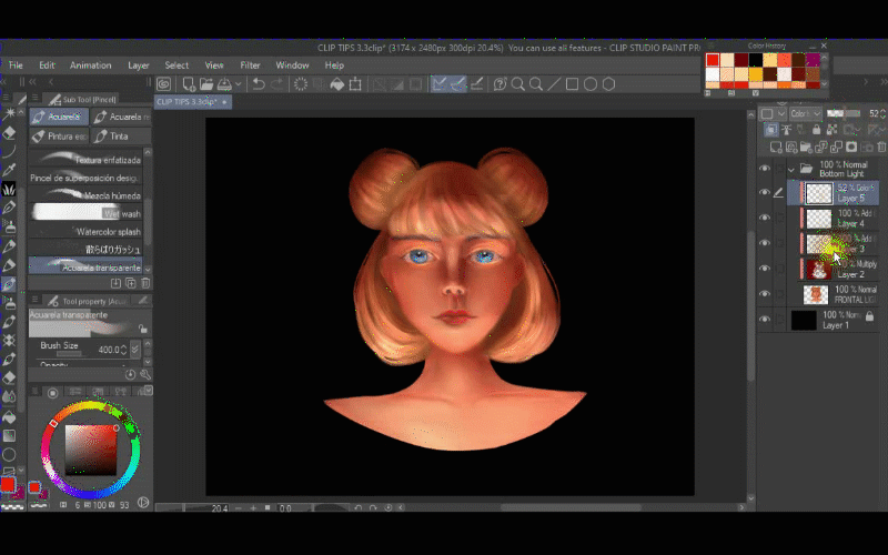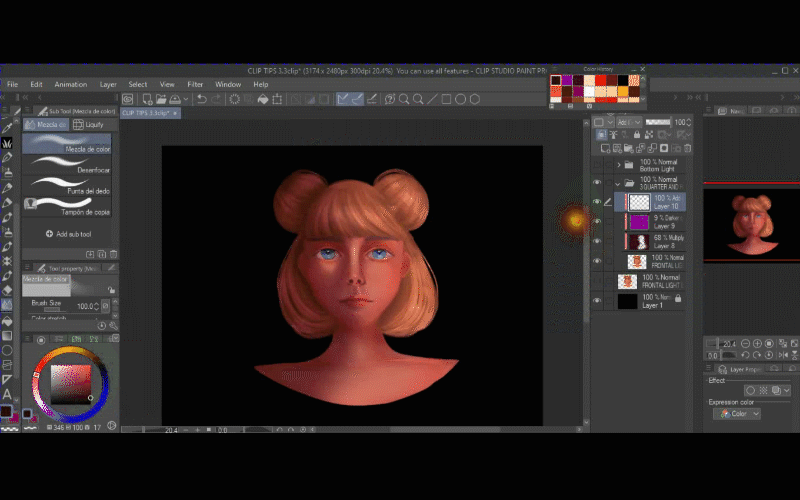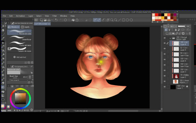 Je me rends compte que la partie du nez semble un peu foncée, alors je crée un nouveau calque et j'utilise le mode de fusion AJOUT LUMINEUX et le masque d'écrêtage. Ainsi, avec le pinceau aquarelle transparent, j'ai redéfini son nez avec une couleur claire.