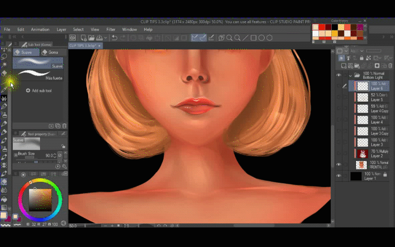 J'ajoute un autre calque avec le mode de fusion AJOUT LUMINEUX et je commence à illuminer ses lèvres.