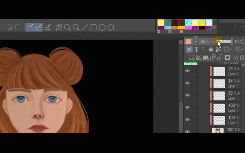 Ensuite, je vais créer un autre calque au-dessus de tous les autres et changer le mode de fusion en AJOUT LUMINEUX. N'oubliez pas d'activer le masque d'écrêtage. Sinon, vous colorierez en dehors de votre calque de peau et ce sera un gâchis, alors restons propres.