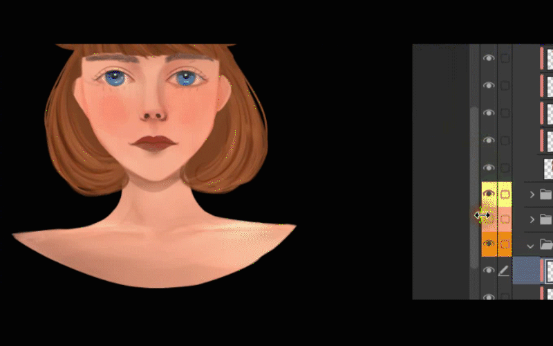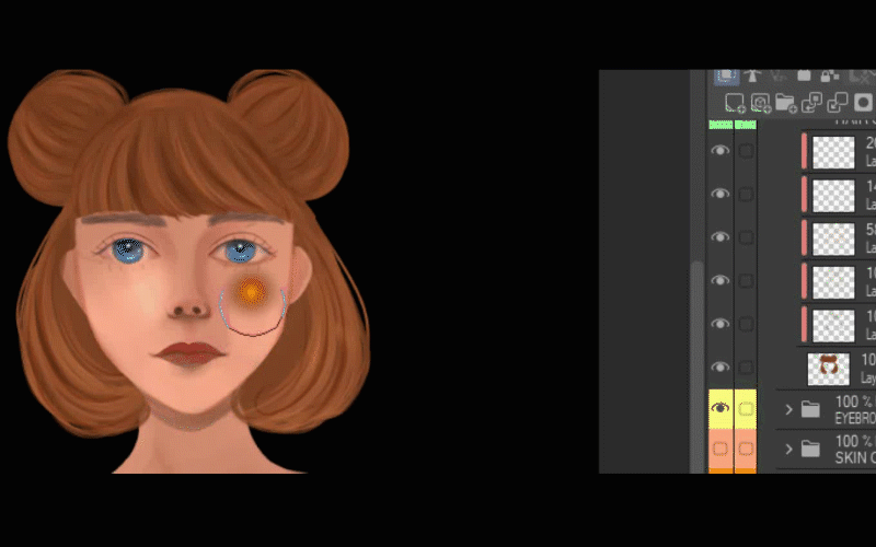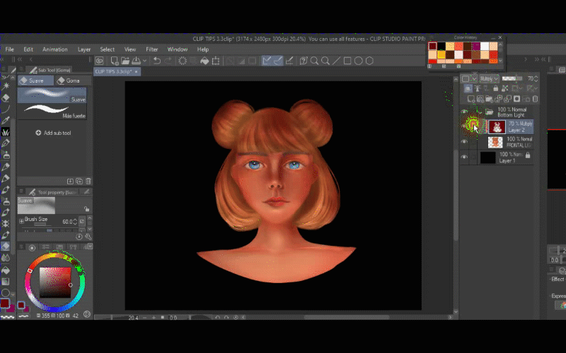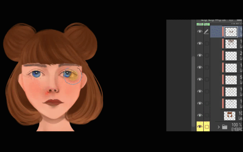 Je procède à son travail sur ses cheveux, alors je vais dans le dossier où j'ai dessiné ses cheveux et je crée un calque au-dessus des autres et j'active le masque d'écrêtage. Ensuite, je prélève la couleur la plus foncée de ses cheveux avec l'outil pipette. Ensuite, je choisis un ton brun encore plus foncé et je commence à ajouter des ombres à ses cheveux.