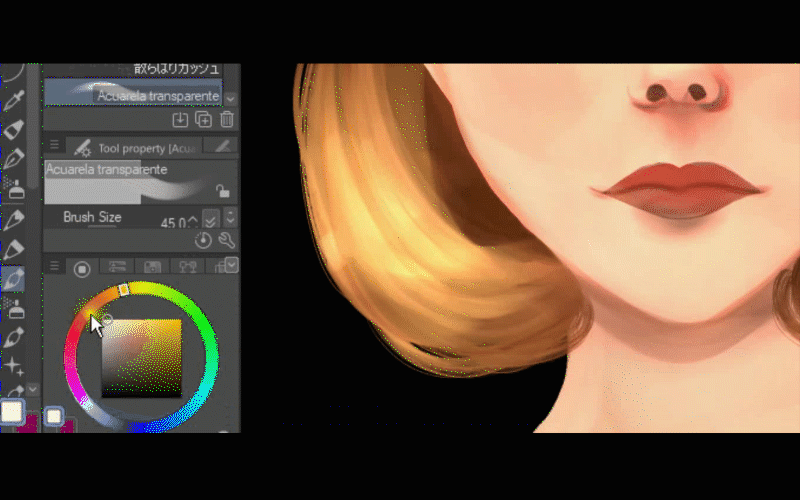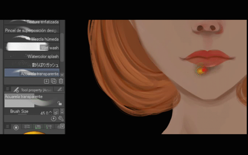 Maintenant, je retourne aux lèvres et j'affine un peu plus la couleur avec le pinceau aquarelle transparent.