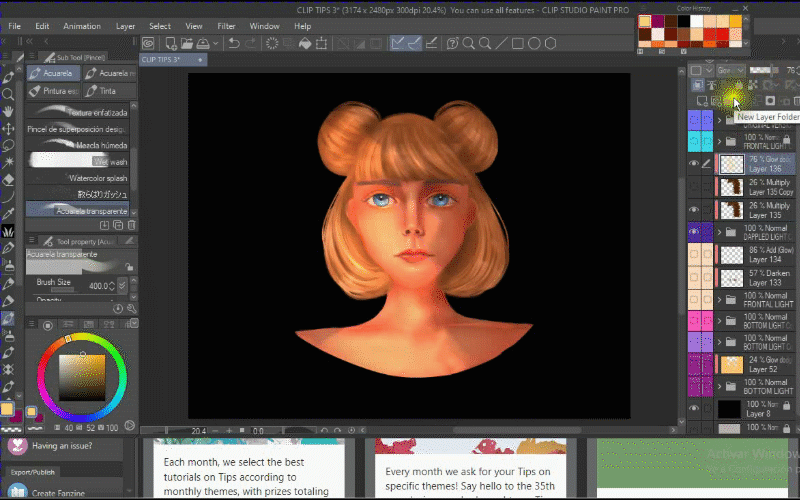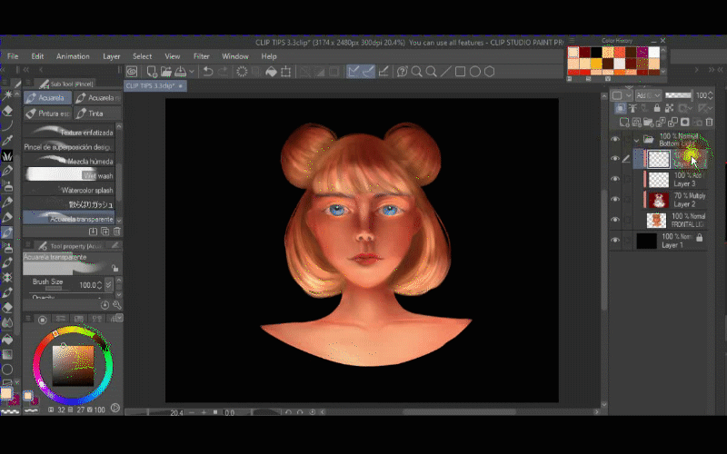 Maintenant, je crée un autre calque avec le masque d'écrêtage et je vais commencer à peindre la lumière avec le pinceau aquarelle transparent.