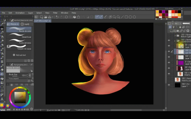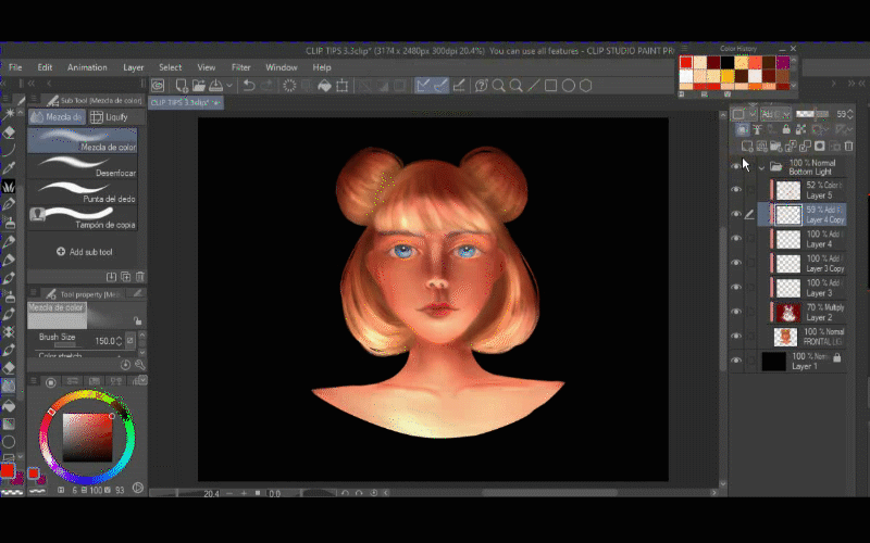 Maintenant, je vais ajouter un autre calque avec le mode de fusion AJOUT LUMINEUX et le masque d'écrêtage, cette fois je choisis une couleur blanche et je peins cinq traits sur ses cheveux et je choisis un pinceau de fusion appelé « mix moisture » et je commence à mélanger la couleur en suivant la direction originale de ses cheveux.