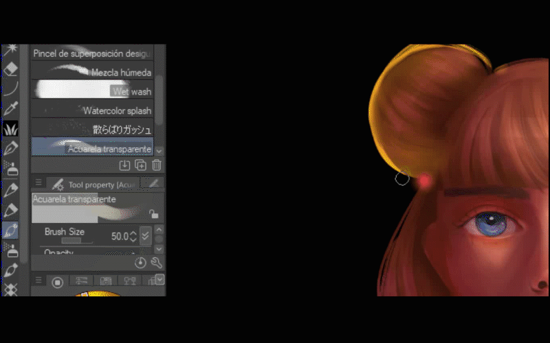 J'utiliserai le pinceau aquarelle transparent et je vais choisir une couleur jaune pour peindre quelques points sur ses cheveux du côté droit.