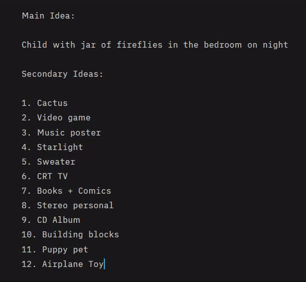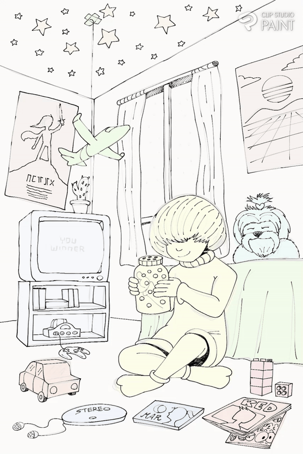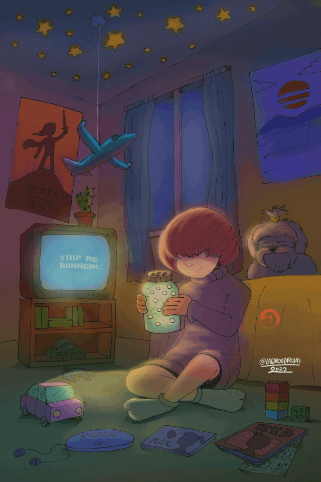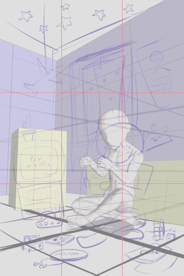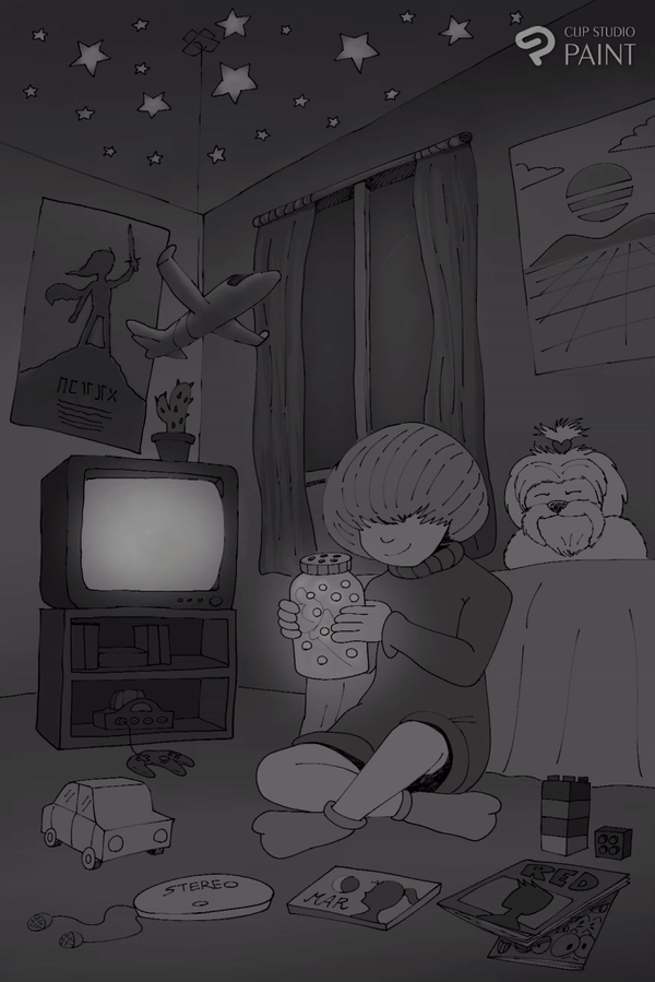 En commençant par l'idée principale comme le garçon dans sa chambre avec sa luciole, puis des idées secondaires pour donner plus d'atmosphère à l'illustration, comme la télévision CRT, les jeux vidéo, votre premier animal de compagnie, la musique et les bandes dessinées.