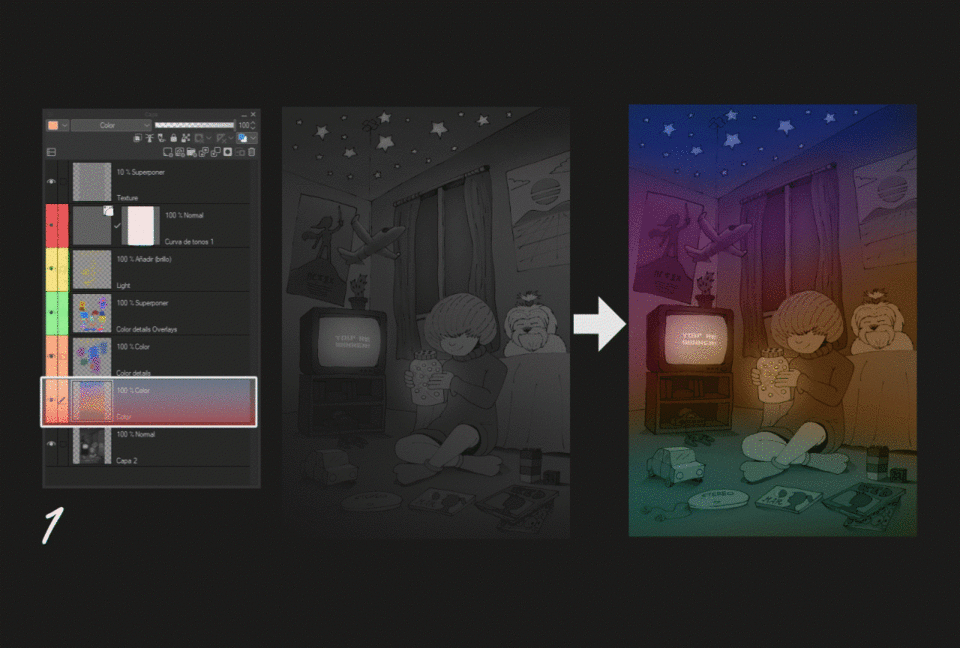 2. Maintenant, un autre calque pour les couleurs de détails, avec le mode de fusion ''Couleur'', et repeignez tous les détails et objets comme, l'affiche, la télévision, le personnage et les jouets...