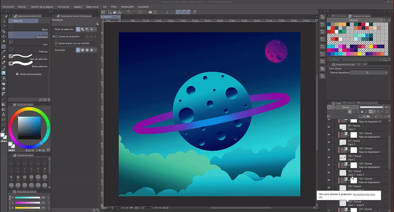 En double-cliquant sur le carré qui se trouve dans le calque de dégradé, les configurations s'ouvrent pour modifier le dégradé ou le changer pour une autre couleur. L'avantage de cette méthode est que nous pouvons essayer autant de couleurs que nous voulons sans perdre de temps et sans endommager le dessin. Les cartes de dégradé sont les meilleures pour les tests de couleur.