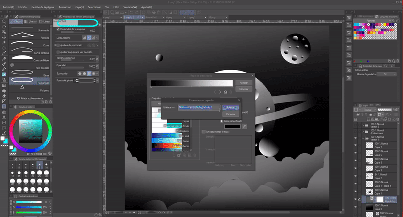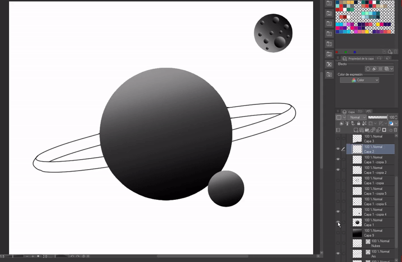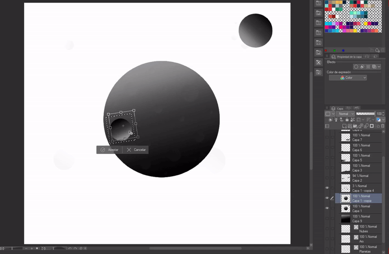 Je voulais que ma planète ait des cratères, pour cela j'ai dupliqué la couche de dégradé, puis en appliquant un "Contrôle + T" avec le clavier, j'ai réduit la figure et je l'ai fait pivoter de sorte que l'ombre soit dans la direction de la lumière, cela lui donne un volume de cratère. Finalement, j'ai décidé d'ajouter plus de planètes, j'ai juste pris celles que j'avais déjà et je les ai réduites à de plus petites.