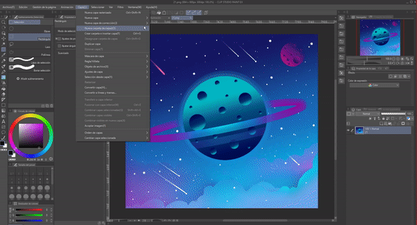 Une fois que vous avez cliqué sur accepter, il faut fusionner le calque de dégradé avec le calque de la planète qui est en échelle de gris, dans ce cas ce serait celui qui est immédiatement en dessous, c'est le calque avec lequel nous avons commencé à appliquer la carte de dégradé.