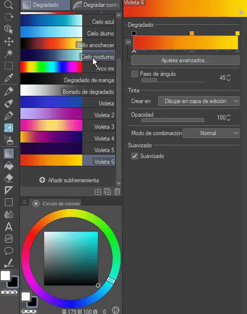 Nous sélectionnerons n'importe quel dégradé existant à l'exception de "Dégradé manga" et "Effacement de dégradé", ceux-ci ayant des configurations différentes d'un dégradé normal, ils ne nous sont donc pas utiles. Une fois que nous aurons sélectionné le dégradé, nous ferons un clic droit dessus, un menu contextuel apparaîtra où nous sélectionnerons l'option "Dupliquer la sous-catégorie d'outil", nous cliquerons sur cette option.
