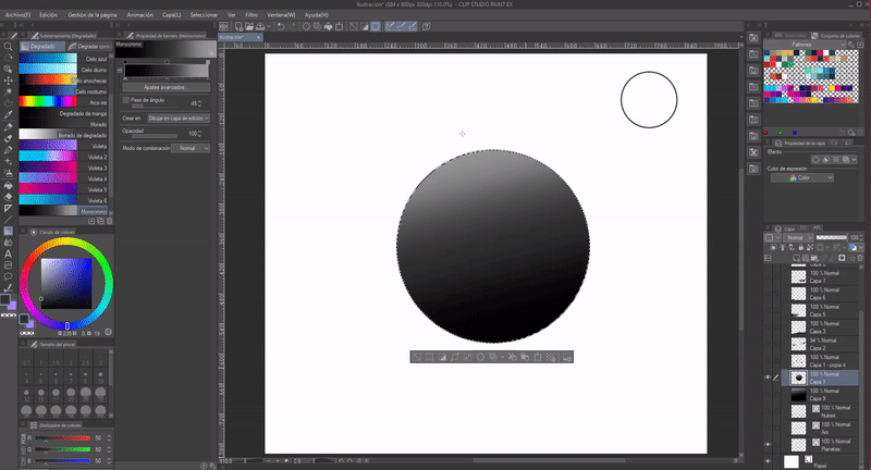 Nous sélectionnerons la surface des cercles avec l'outil "Sélection automatique", ce qui nous permet d'appliquer le dégradé uniquement sur la partie du cercle. Nous pouvons appliquer les dégradés dans n'importe quelle direction, je les appliquerai en diagonale de manière à ce que la lumière éclaire la partie supérieure et l'ombre la partie inférieure. J'ai appliqué les dégradés sur une nouvelle couche au-dessus de l'esquisse. Une fois terminé, il faut masquer la couche de l'esquisse pour que les lignes ne soient pas visibles.
