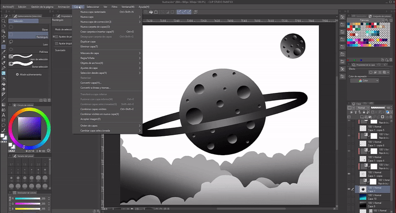 Deuxièmement, avec l'outil "Gomme douce" à opacité moyenne, j'ai effacé une partie des nuages pour qu'ils paraissent plus brumeux, avec une certaine translucidité. J'ai fait de même avec l'anneau qui entoure la planète, j'ai doucement effacé certaines parties pour qu'il se fonde avec le fond.