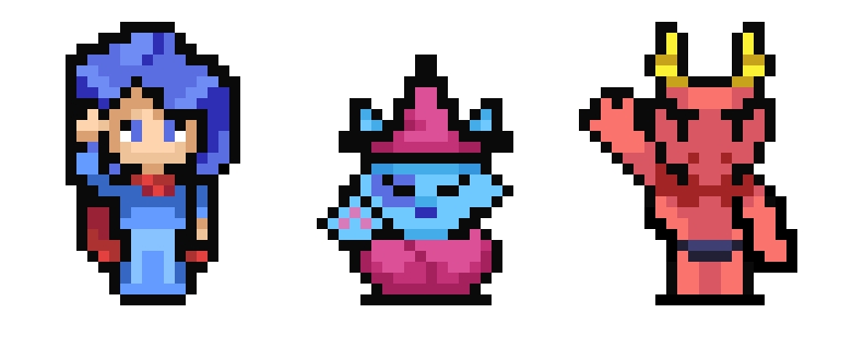 Permettez-moi de vous présenter les personnages de ce tutoriel : la guerrière violette, le sorcier félin et le sorcier kobold !