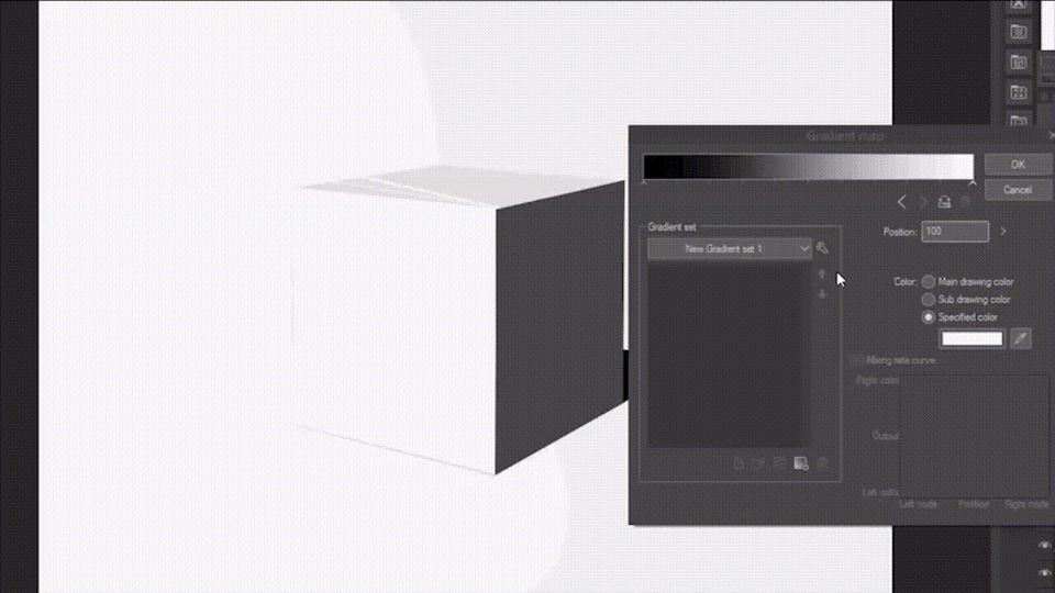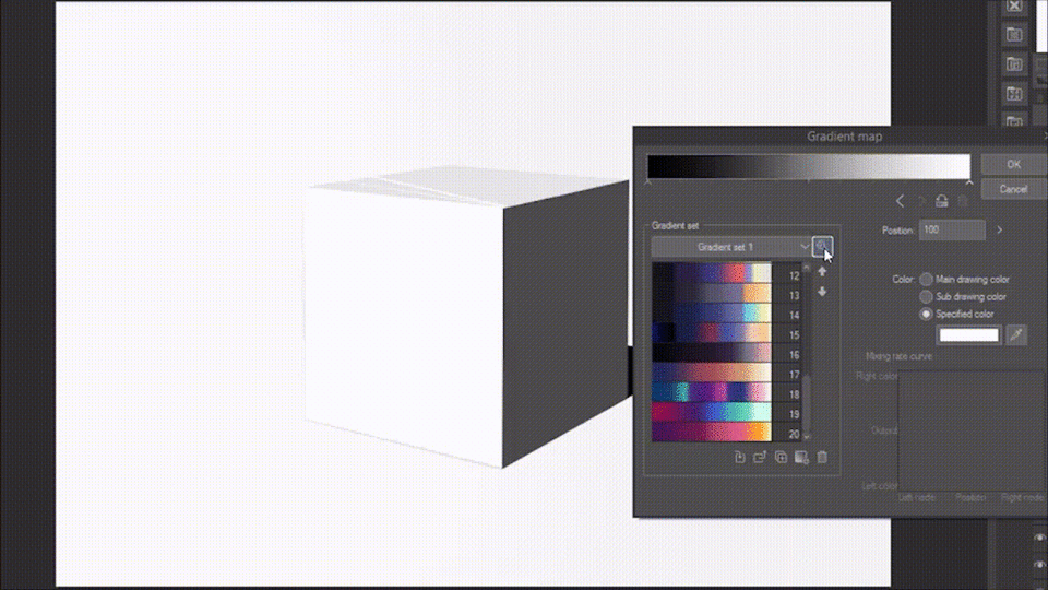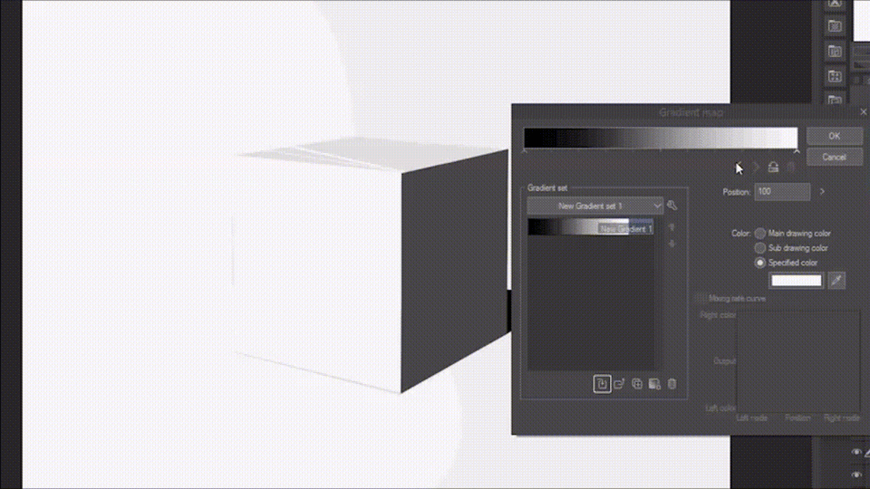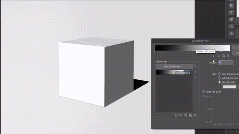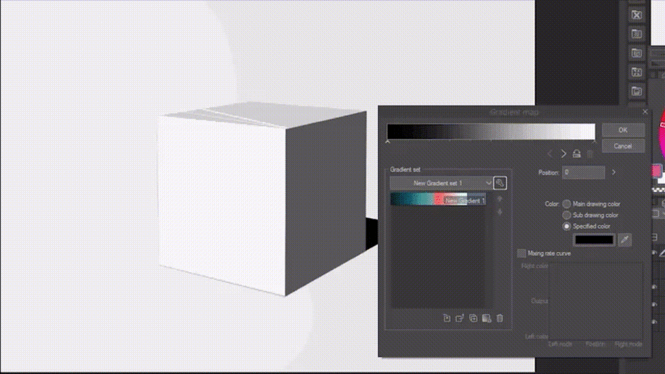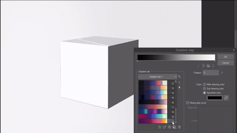 Ci-dessous, j'ai composé une carte de dégradé où seule la saturation change, et je l'ai appliquée à un simple dessin d'un cube.