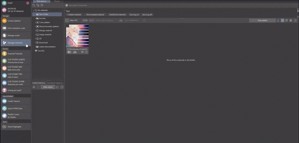 Pour le publier sur Assets, vous devrez ouvrir Clip Studio - comme le programme général que l'on peut voir ci-dessous. Dans la barre de gauche, trouvez la section "Gérer les matériaux" et cliquez dessus.