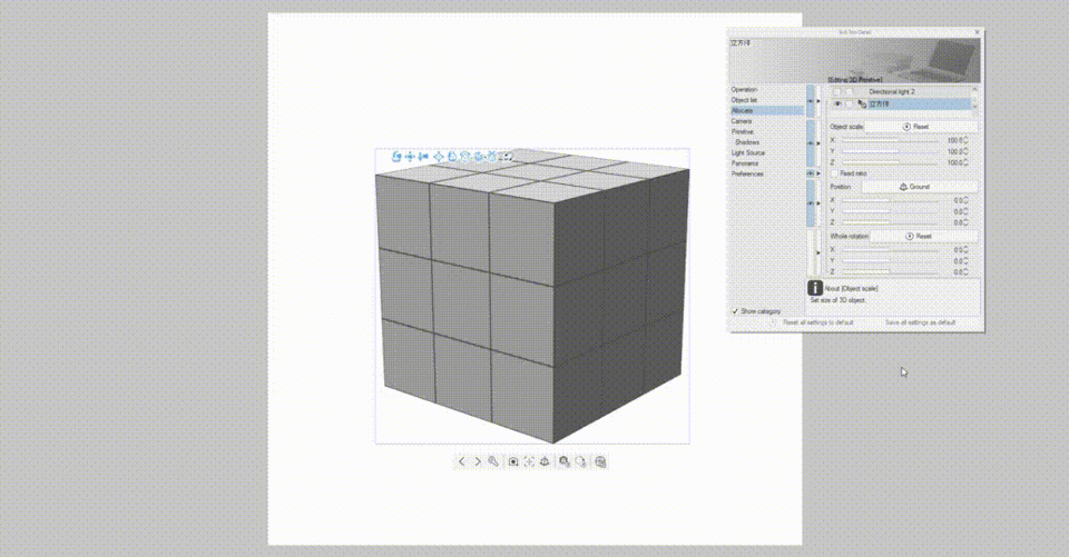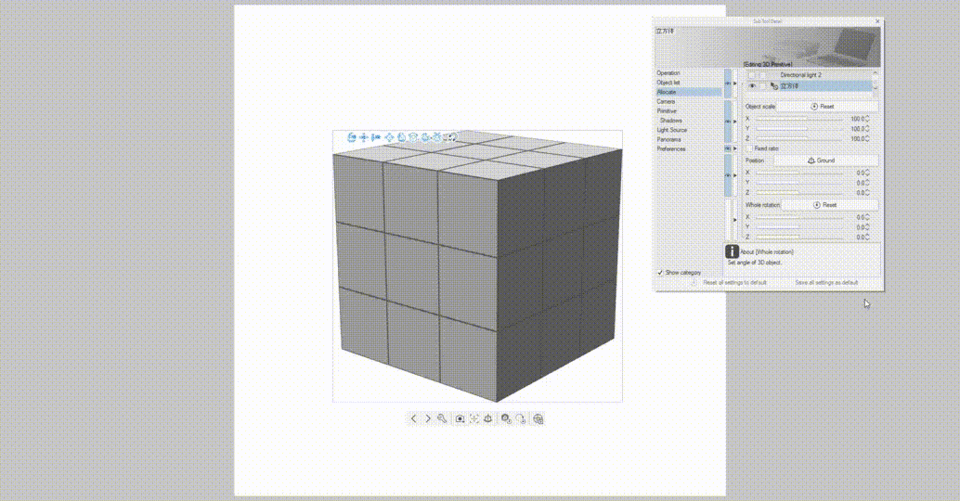 Vous pouvez également utiliser la taille et la position paramétriques de l'objet dans la palette [Détail de l'outil secondaire] (cliquez sur l'icône de la clé à molette) pour déplacer/faire pivoter/redimensionner le cube de manière paramétrique en y saisissant une valeur. Cette fonctionnalité paramétrique est celle que nous utiliserons principalement dans ce tutoriel.