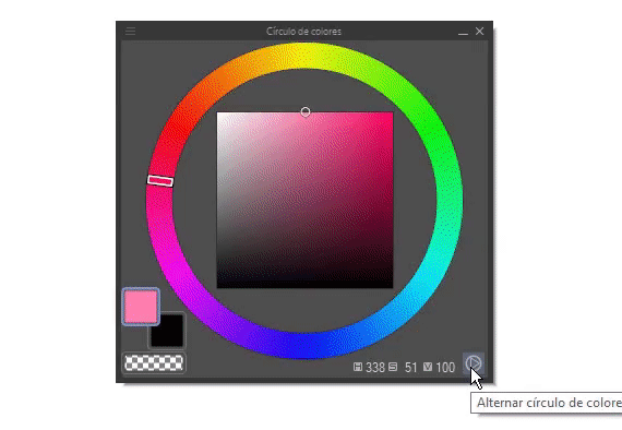 Vous connaissez déjà le cercle chromatique, et au début de ce TIP, je vous ai expliqué comment ces couleurs apparaissent et comment les maîtriser. Le cercle de Clip Studio utilise le modèle CMJN pour orienter les couleurs, mais en connaissant les fondamentaux, le modèle n'a pas d'importance. De plus, nous pouvons afficher le cercle de deux manières différentes : en espace de couleur TSL ou HSL. Pour cela, il suffit de cliquer sur le cercle inférieur droit.