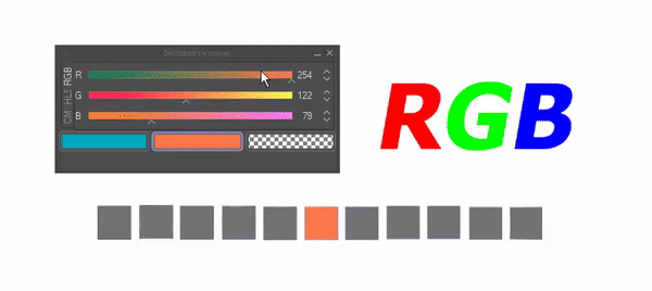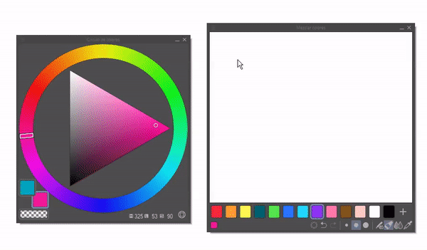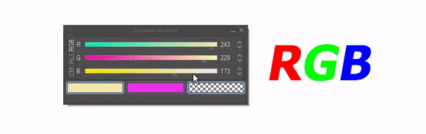 Nous allons commencer par cette fonction. Cet outil nous permet de changer le modèle de couleur entre RVB, HSL et CMJN. À partir de cet outil, vous pouvez obtenir la luminosité, la saturation ou les tons d'une couleur sélectionnée dans le cercle chromatique. La première icône de couleur correspond à la couleur primaire, la seconde à la secondaire et la troisième est la transparence (si le pinceau est utilisé, il agit comme une gomme).